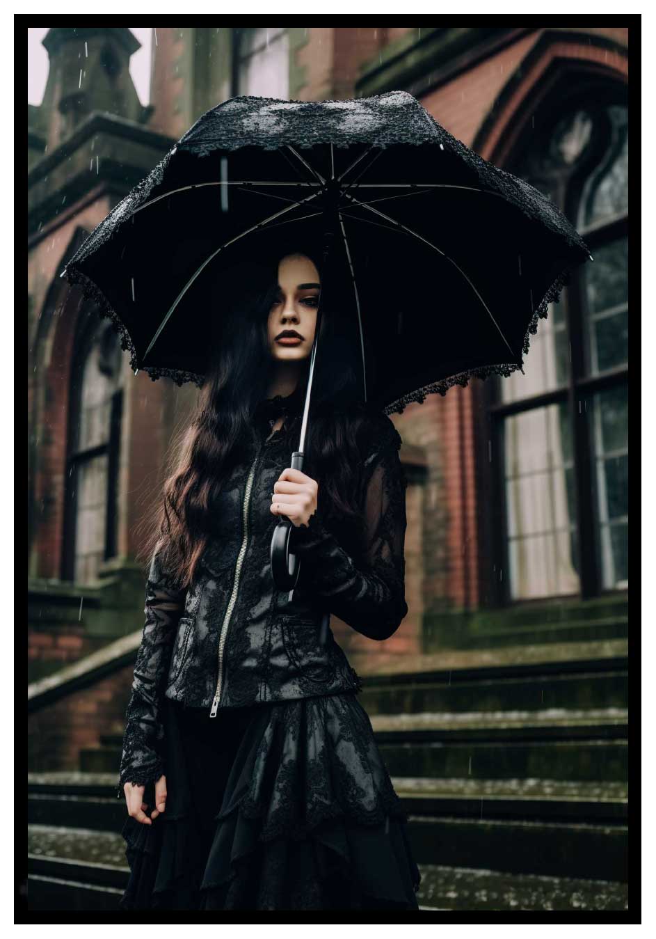 Inred väggen med en unik och elegant affisch med motiv på en vacker kvinna klädd i gotiska kläder som står i regnet med ett svart paraply. Affischen matchar bra ihop med andra gotiska bilder och inredning med goth-tema.
