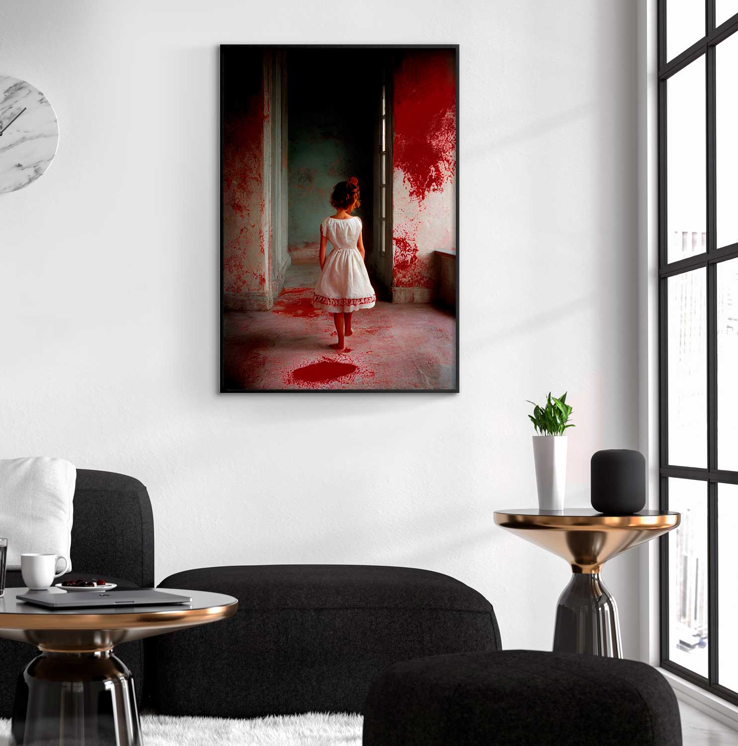Unik poster med motiv av en flicka i vit klänning i ett hus med röda stora fläckar på väggarna. En mystisk bild som man i abstrakt avseende får tolka på sitt eget vis. Postern passar bra hemma hos dig som gillar skräckfilmer och konst med mörk inriktning.